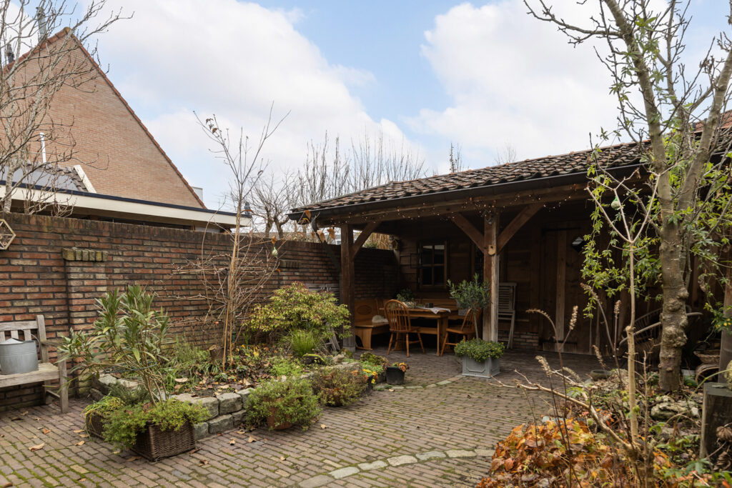 De achtertuin is netjes aangelegd om buiten te genieten. Een absolute eyecatcher is de hoogwaardige houten schuur met overkapping, gerealiseerd door Henk Bennink Houtbouw: een sfeervolle en duurzame plek waar je het hele jaar door kunt zitten, borrelen of lange avonden met vrienden doorbrengt.