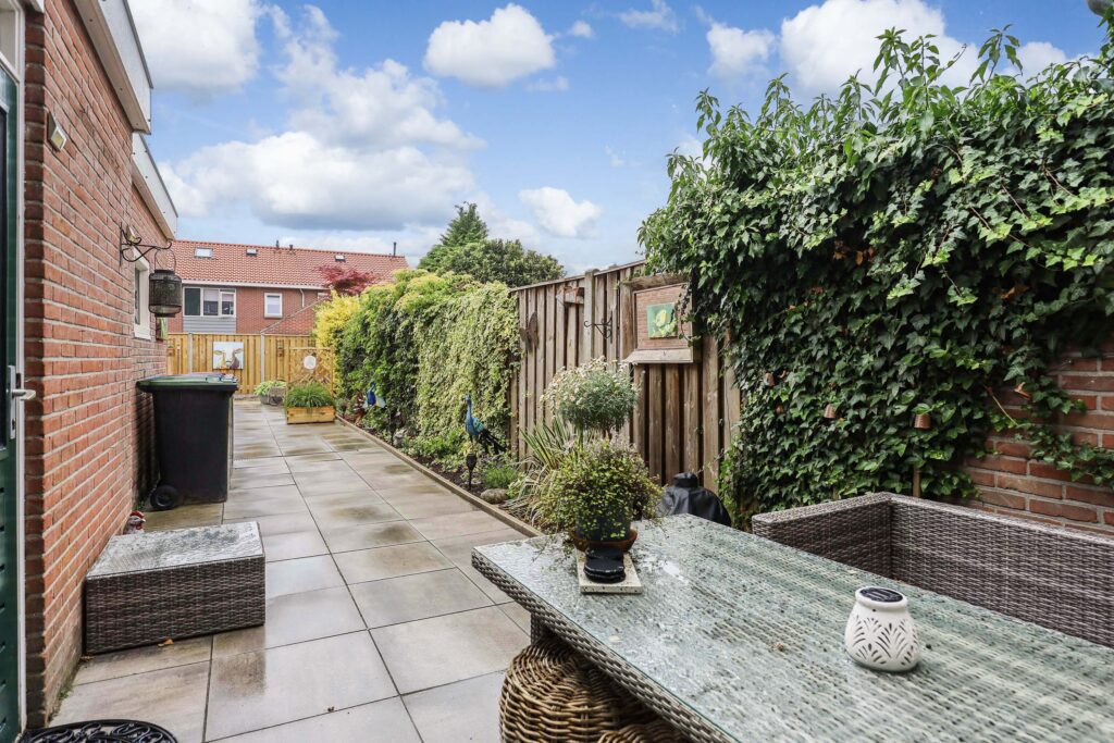 De achtertuin ligt op het zuiden en is daardoor heerlijk zonnig. Een fijne, groene tuin waar je volop kunt genieten van lange zomeravonden of juist een rustige ochtend met een kop koffie.